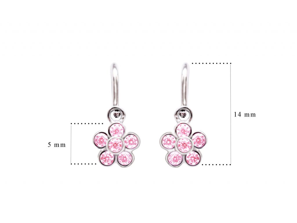 Detské náušničky so zapínaním typu brizúra sú vyrobené z bieleho zlata a osadené ružovými zirkónovými kamienkami. Zlaté náušnice sú označené puncovou značkou 585/1000 od štátneho puncového úradu. Tento typ zapínania je najlepším výberom pre prvé náušničky. Všetky rozmery sú zobrazené veľmi podrobne v produktovej doplňujúcej fotografii. Náušnice pre vás vyrábame ručně za použitia tradičných metód. Náušnice vám dodáme v originálnom balenie.