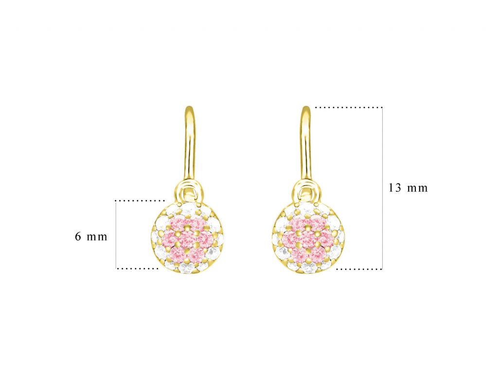 Detské náušničky so zapínaním na brizúru sú vyrobené zo žltého zlata a osadené ružovými zirkónovými kamienkami uprostred a bielymi okolo. Zlaté náušnice sú opatrené puncovou značkou 585/1000 od štátneho puncového úradu. Tento typ zapínania je najlepším výberom pre prvé náušničky. Rozmery výrobku sú detailne zobrazené v produktovej doplňujúcej fotografii. Náušnice pre vás vyrábame ručne za použitia tradičných metód. Náušnice Vám dopravíme v darčekovom balení.