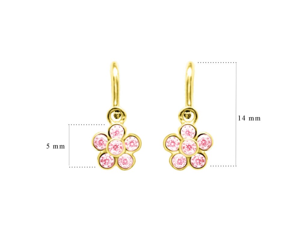 Detské náušničky so zapínaním typu brizúra sú vyrobené zo žltého zlata a osadené ružovými zirkónovými kamienkami. Zlaté náušnice sú označené puncovou značkou 585/1000 od štátneho puncového úradu. Tento typ zapínania je najlepším výberom pre prvé náušničky. Všetky rozmery sú zobrazené veľmi podrobne v produktovej doplňujúcej fotografii. Náušnice pre vás vyrábame ručně za použitia tradičných metód. Náušnice vám dodáme v originálnom balenie.