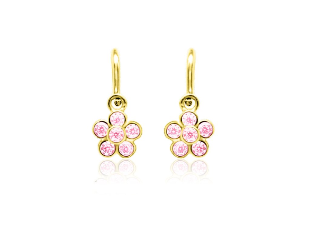 Kvetinkové náušnice DU 35005 zo žltého zlata s ružovými kamienkami, zapínanie brizúra