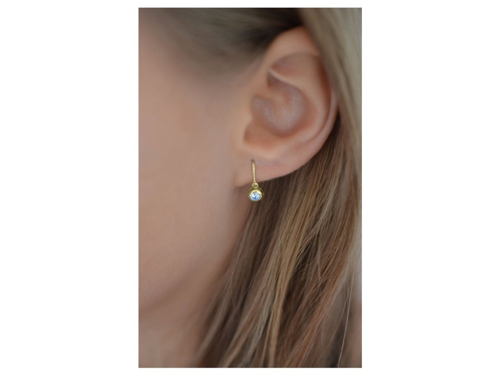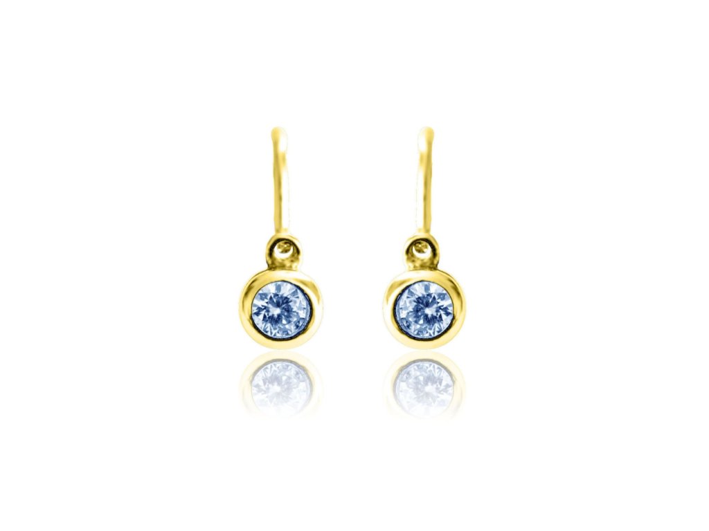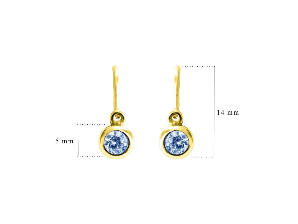 Detské náušničky so zapínaním na brizúru sú vyrobené zo žltého zlata a osadené svetlo modrými zirkónovými kamienkami. Zlaté náušnice sú opatrené puncovou značkou 585/1000 od štátneho puncového úradu. Tento typ zapínania je najlepším výberom pre prvé náušničky. Rozmery výrobku sú detailne zobrazené v produktovej doplňujúcej fotografii. Náušnice pre vás vyrábame ručne za použitia tradičných metód. Náušnice Vám dopravíme v darčekovom balení.