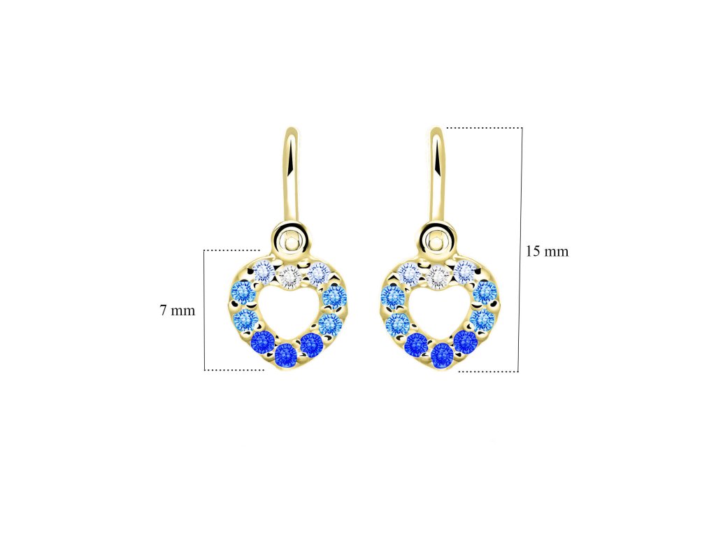 Náušnice srdiečka DU 70508 zo žltého zlata s bielymi a modrými kamienkami, zapínanie brizúra