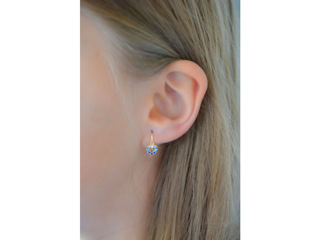 Detské náušničky so zapínaním na brizúru sú vyrobené zo žltého zlata a osadené bielymi a modrými zirkónovými kamienkami. Zlaté náušnice sú opatrené puncovou značkou 585/1000 od štátneho puncového úradu. Tento typ zapínania je najlepším výberom pre prvé náušničky. Rozmery výrobku sú detailne zobrazené v produktovej doplňujúcej fotografii. Náušnice pre vás vyrábame ručne za použitia tradičných metód. Náušnice Vám dopravíme v originálnej krabičke.