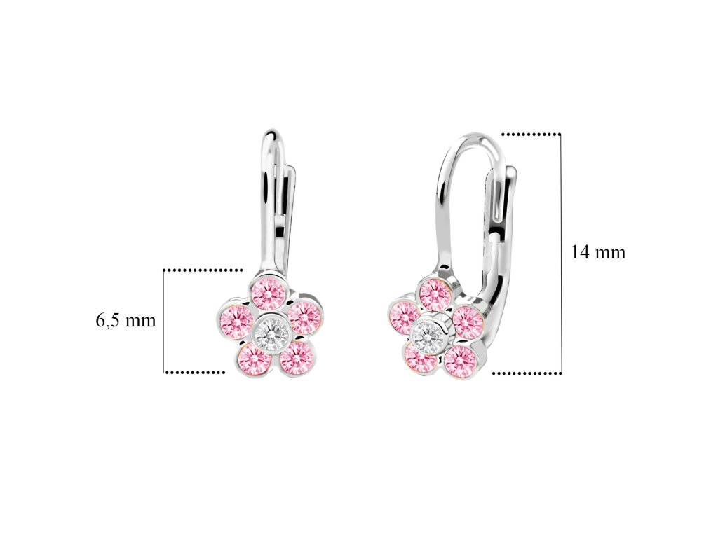 Dievčenské náušničky so zapínaním na klapku sú vyrobené z bieleho zlata a osadené bielymi kamienkami uprostred a ružovými okolo. Zlaté náušnice sú opatrené puncovou značkou 585/1000 od štátneho puncového úradu. Tento typ zapínania je najlepším výberom pre dievčatká, ktoré už odrástli bábätkovským náušničkám. Rozmery výrobku sú detailne zobrazené v produktovej doplňujúcej fotografii. Náušnice pre Vás vyrábame ručne za použitia tradičných metód. Náušnice Vám dopravíme v originálnej krabičke.