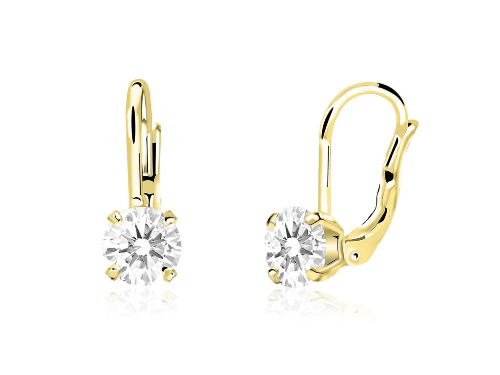 Dievčenské náušničky so zapínaním na klapku sú vyrobené zo žltého zlata a osadené bielymi kamienkami. Zlaté náušnice sú opatrené puncovou značkou 585/1000 od štátneho puncového úradu. Tento typ zapínania je najlepším výberom pre dievčatká, ktoré už odrástli bábätkovským náušničkám. Rozmery výrobku sú detailne zobrazené v produktovej doplňujúcej fotografii. Náušnice pre Vás vyrábame ručne za použitia tradičných metód. Náušnice Vám dopravíme v originálnej krabičke.